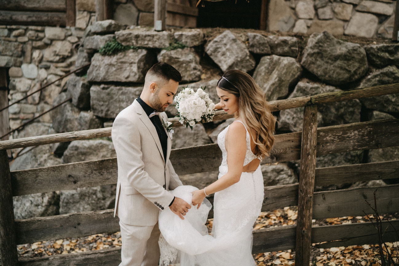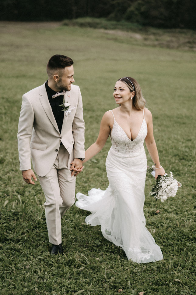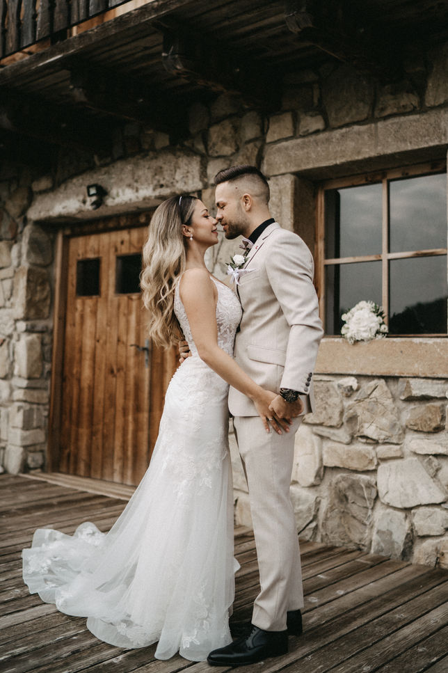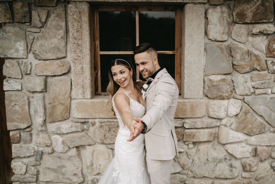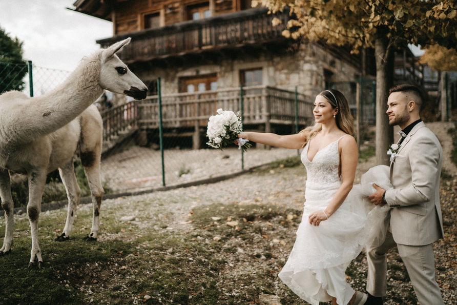 Es war ein wunderschöner sonniger Tag und die beiden hatten sichtlich Spaß beim Paarshooting. Die Alpakas haben auch vorbeigeschaut und wollten sich am Brautstrauß zu schaffen machen. Am Abend wurde ausgelassen gefeiert.